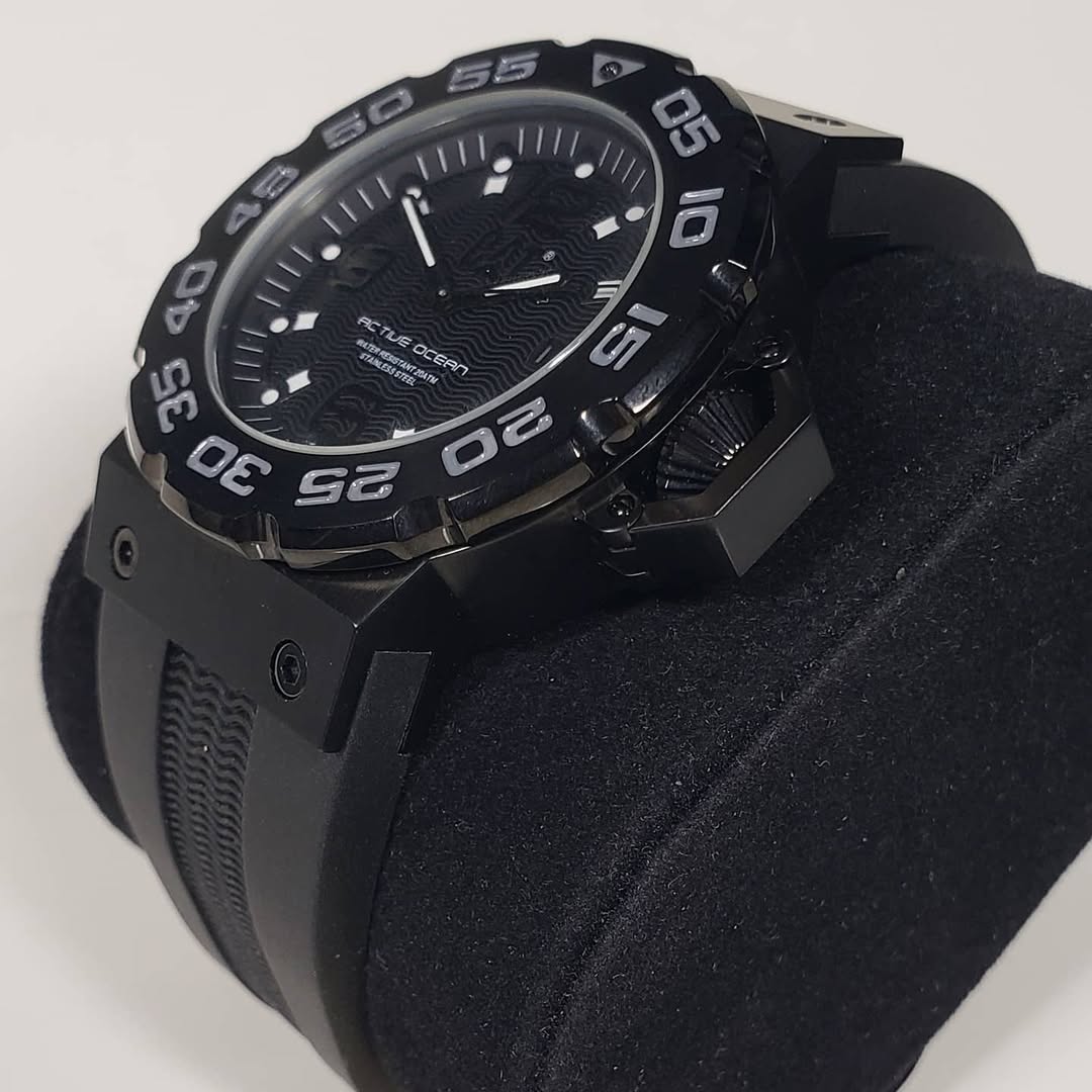 Cualquier dato relevante adicional: Diseño de caja con protectores de corona integrados de gran volumen. Pertenece a la serie «ACTIVE OCEAN». Inscripciones «ACTIVE OCEAN», «WATER RESISTANT 20ATM» y «STAINLESS STEEL» presentes en la esfera.