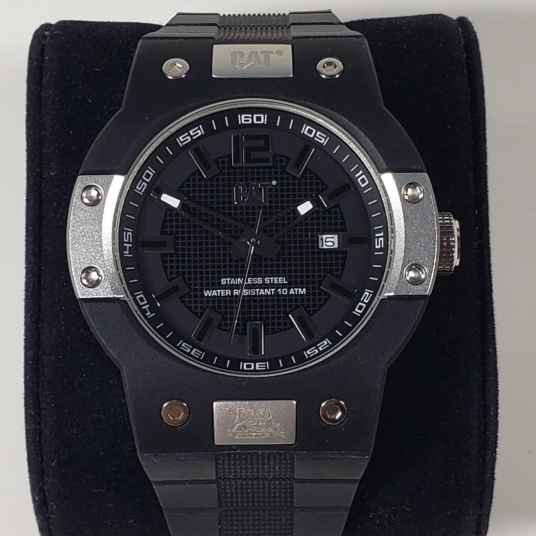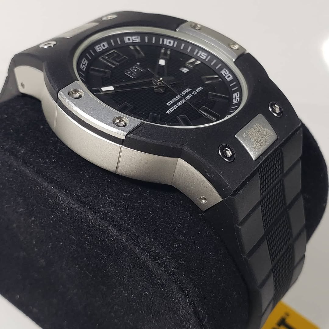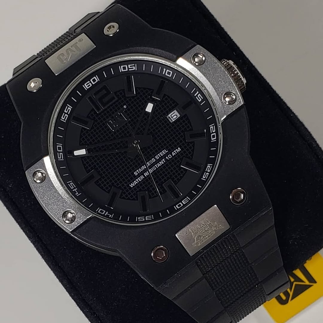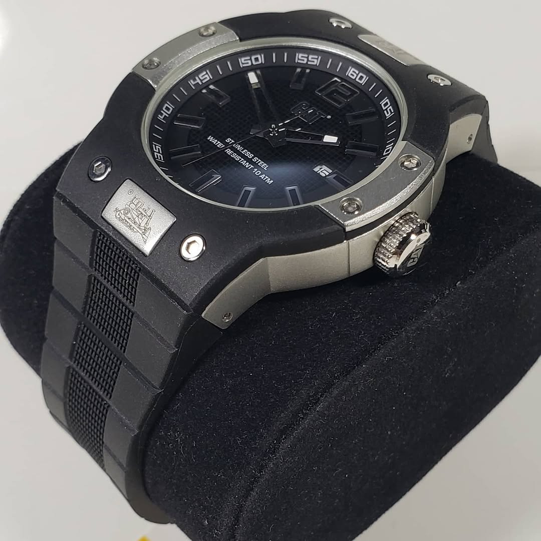 • Esfera Técnica: Presenta un dial negro con un sofisticado patrón de cuadrícula técnica que resalta los índices aplicados y las manecillas esqueletizadas. Incluye una ventana de fecha a las 3 en punto y el icónico logo CAT en relieve bajo las 12.