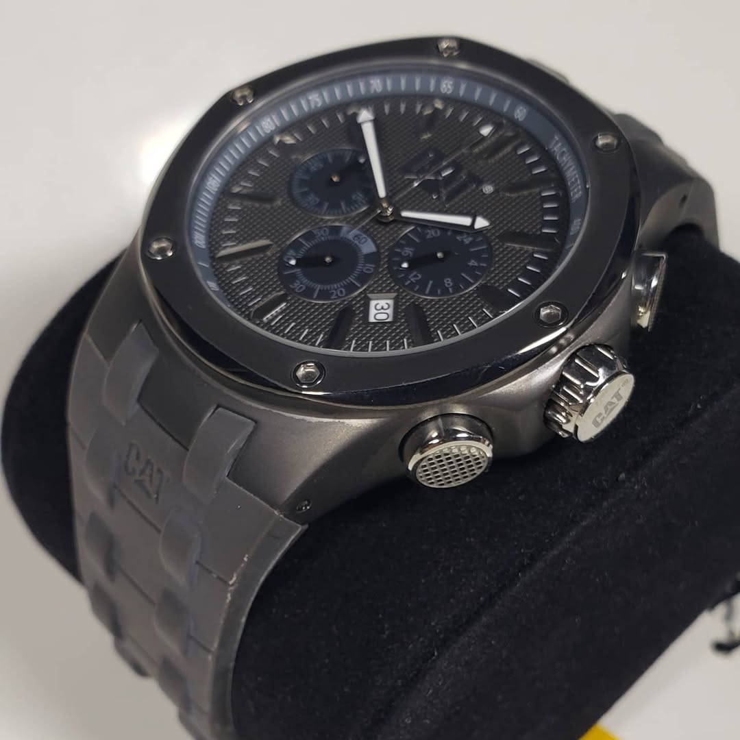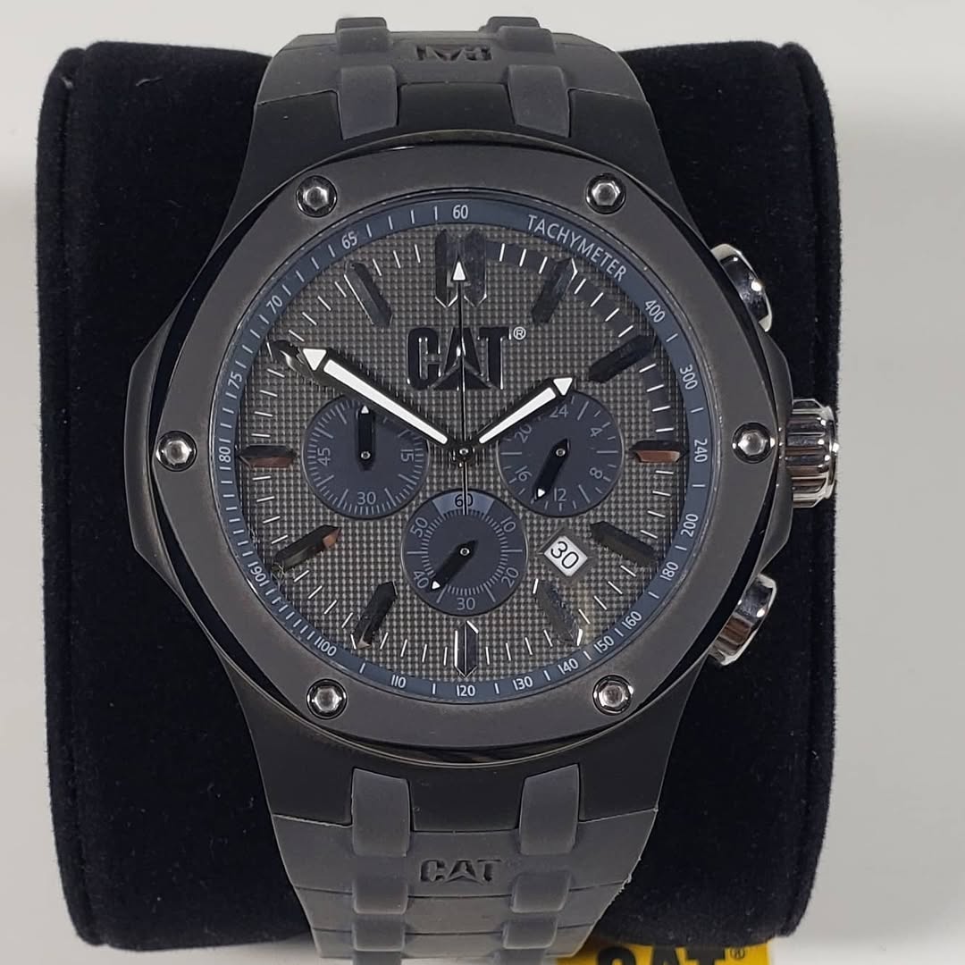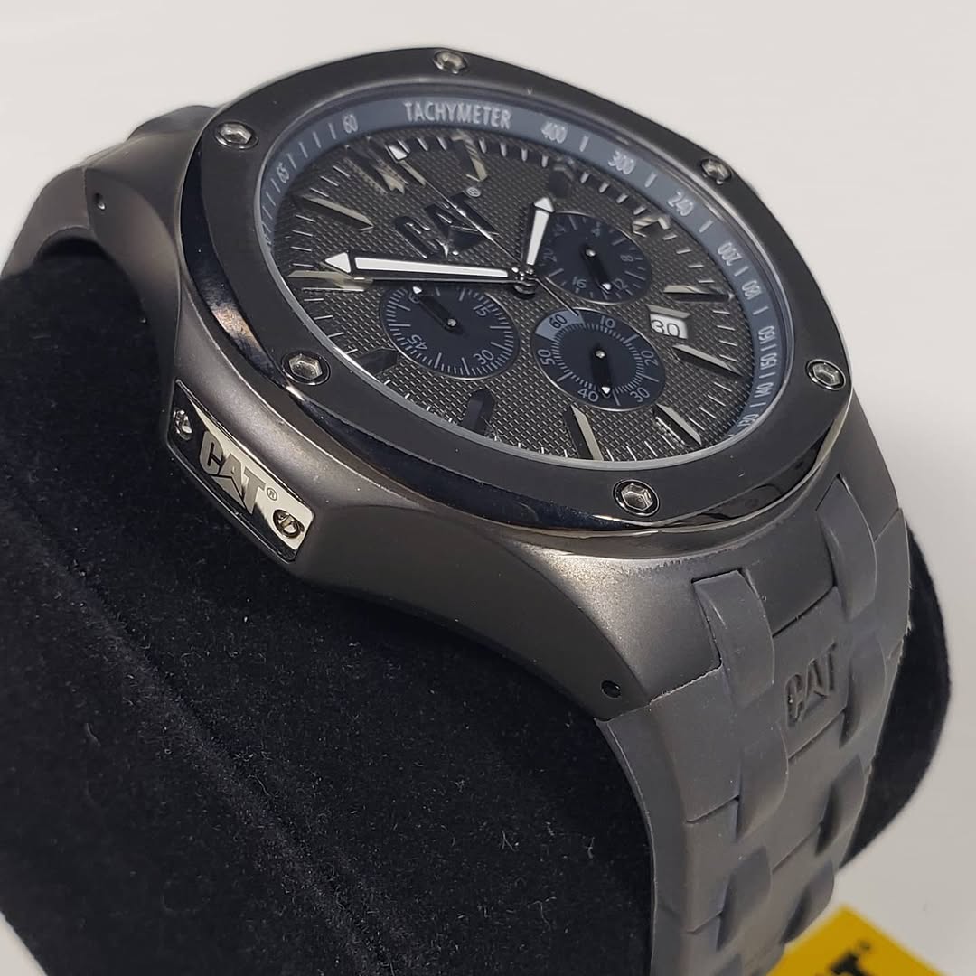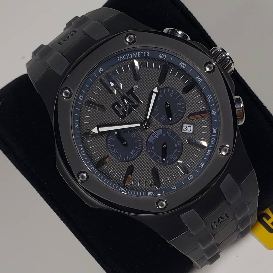 Sigilo táctico y precisión cronográfica. El CAT Caterpillar Navigo A1153-25525 12274 domina el arte del diseño oscuro y sofisticado, combinando una estética industrial «stealth» con la funcionalidad avanzada de un cronógrafo de alto rendimiento.