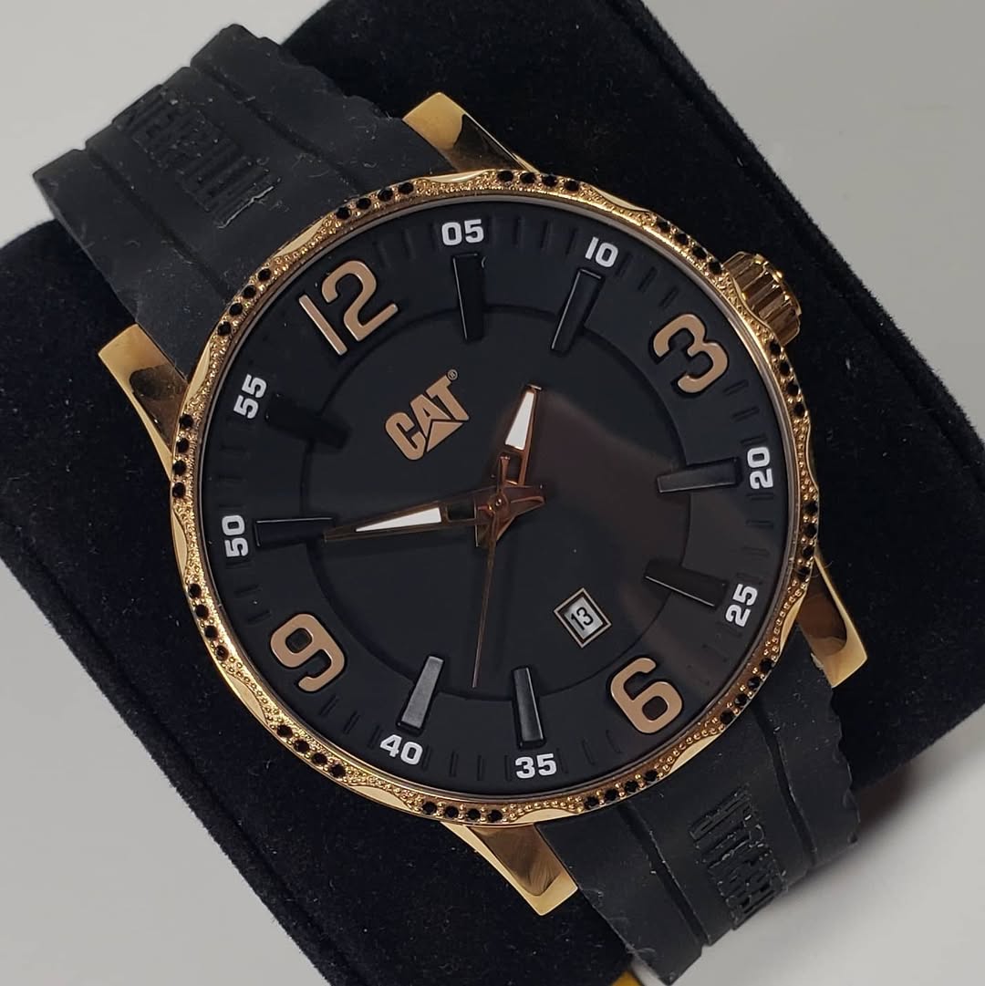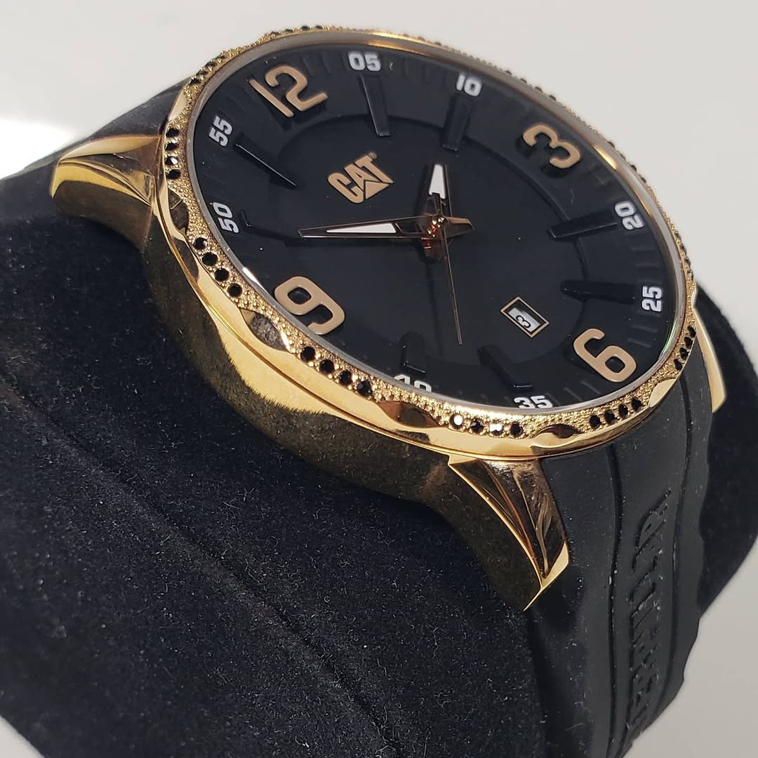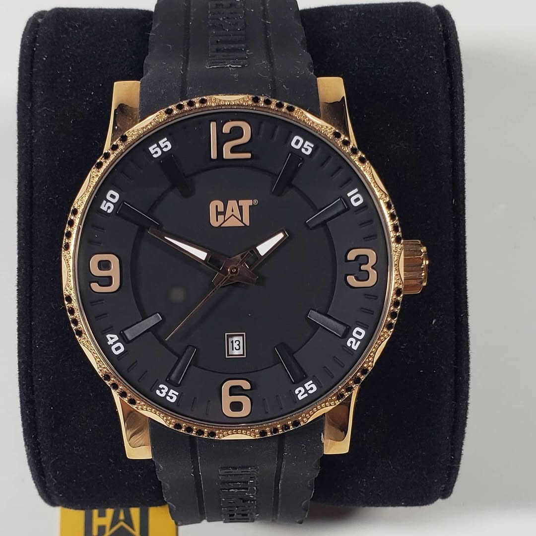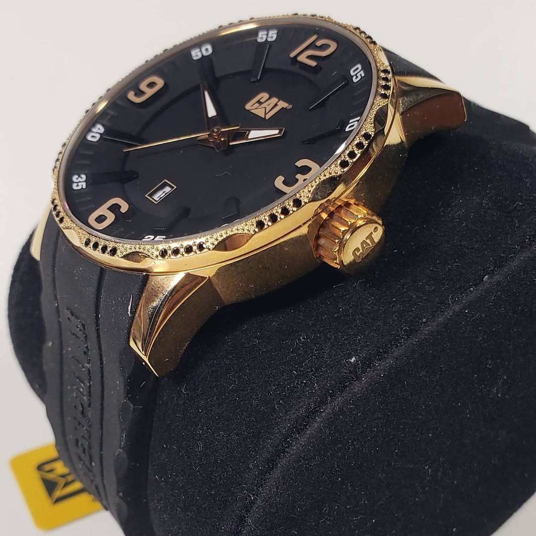 • Cualquier dato relevante adicional: Pertenece a la serie NJ231. Este modelo destaca por la combinación de lujo y robustez, integrando cristales negros en el bisel que contrastan con el acabado dorado de la caja y el diseño industrial de la correa. Presenta el logotipo «CAT» centrado bajo las 12 en punto.