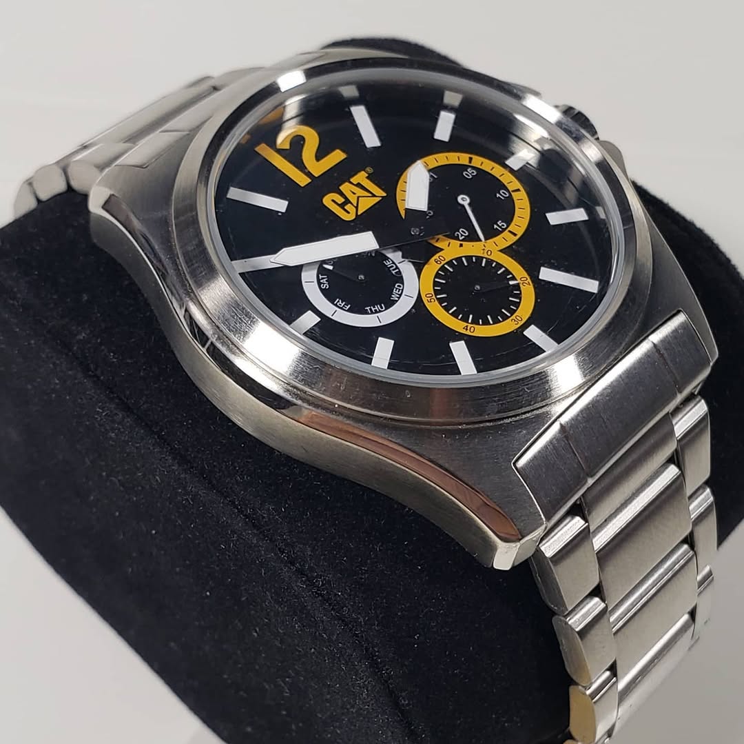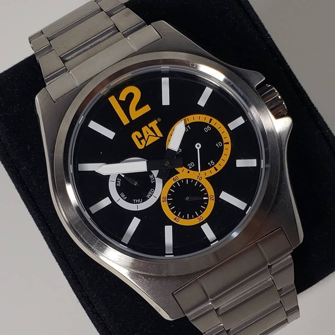 Precisión Multi-función: Equipado para el rendimiento, cuenta con tres subesferas integradas que indican el día de la semana, la fecha y el segundero, ofreciendo un control total del tiempo con una estética que recuerda a los paneles de control de las excavadoras CAT.