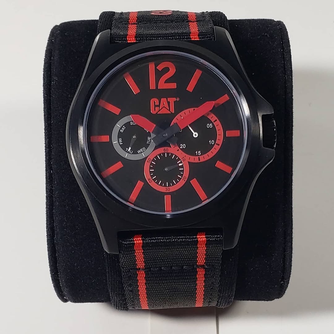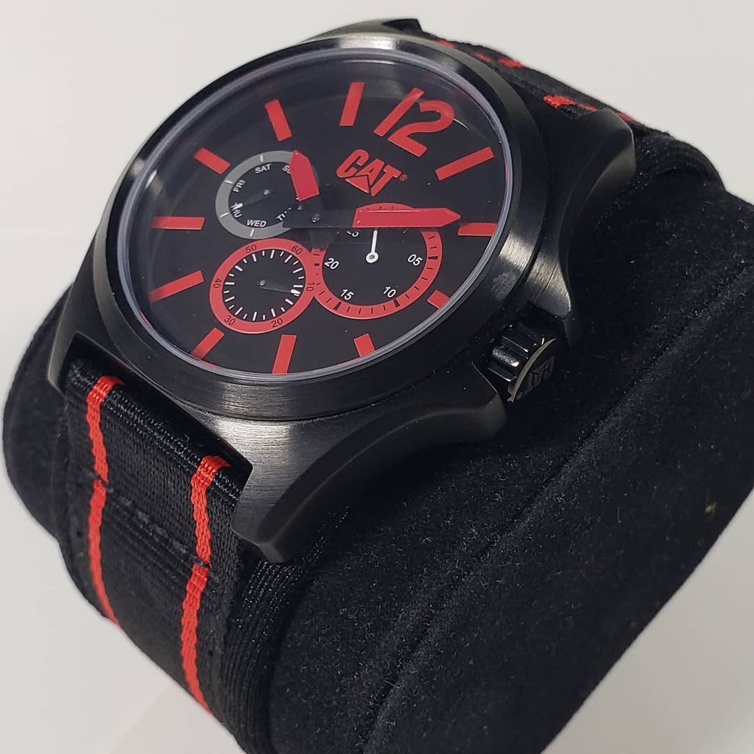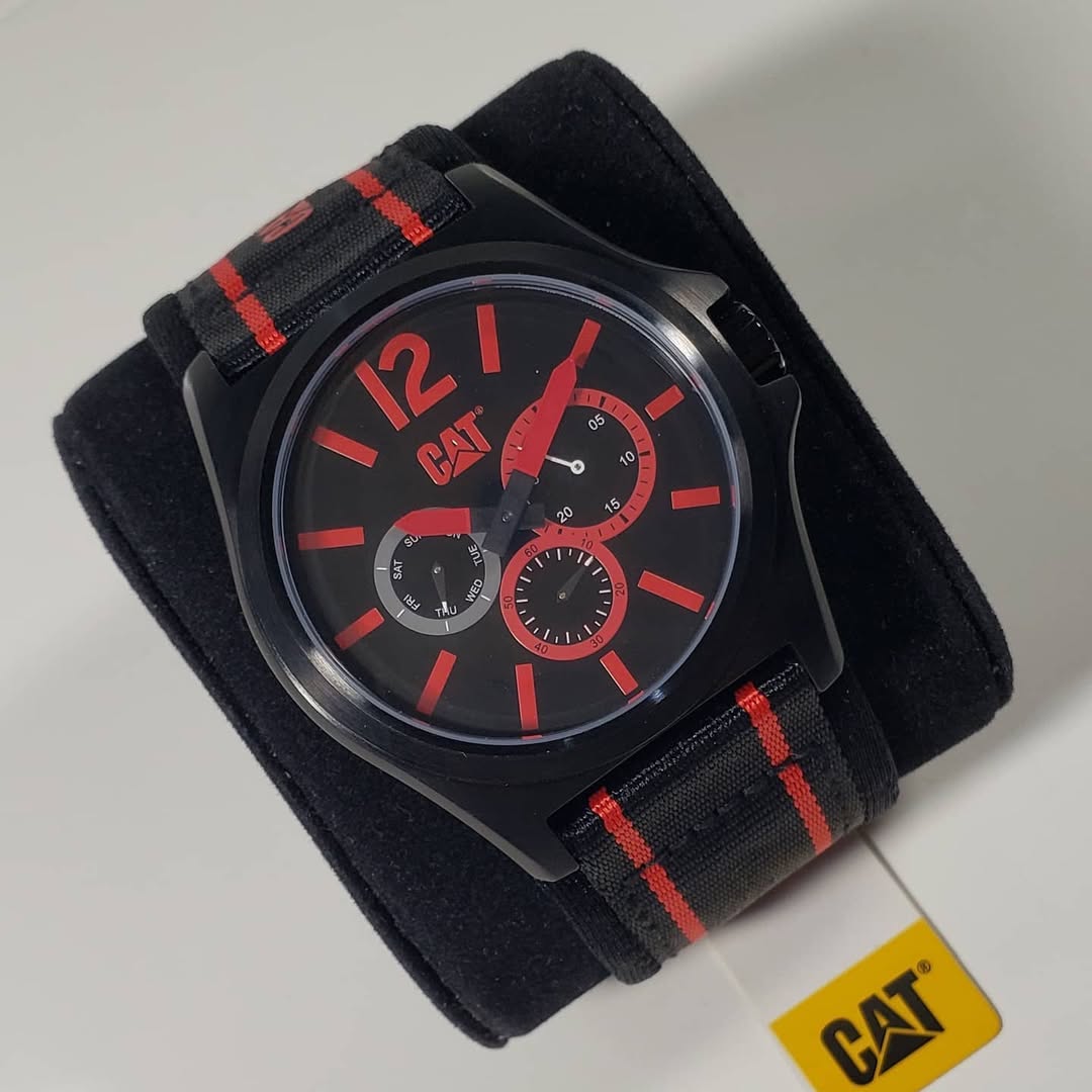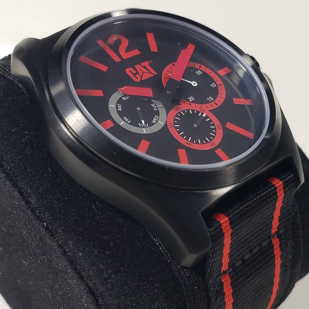 Funcionalidad Multi-esfera: Como toda herramienta de precisión CAT, este modelo es multifunción. Integra tres subesferas técnicas que permiten monitorear el día de la semana, la fecha y el segundero, todas enmarcadas en anillos que refuerzan su diseño de panel de competición.