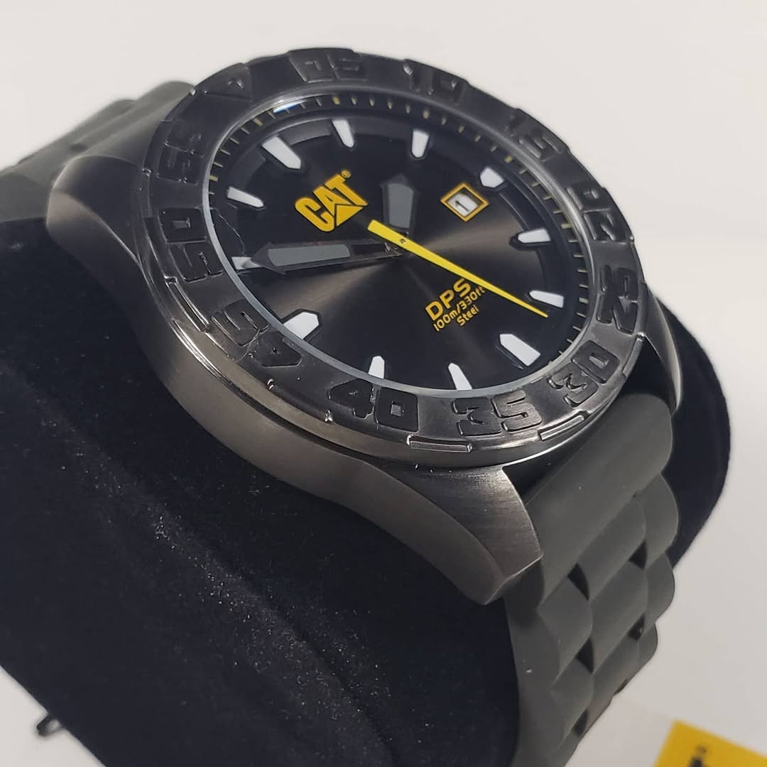 Estética «Stealth»: Su imponente caja de acero con acabado negro mate y su bisel con numeración en relieve le otorgan un aspecto blindado. Es una pieza diseñada para pasar desapercibida hasta que el contraste del amarillo CAT reclama toda la atención.