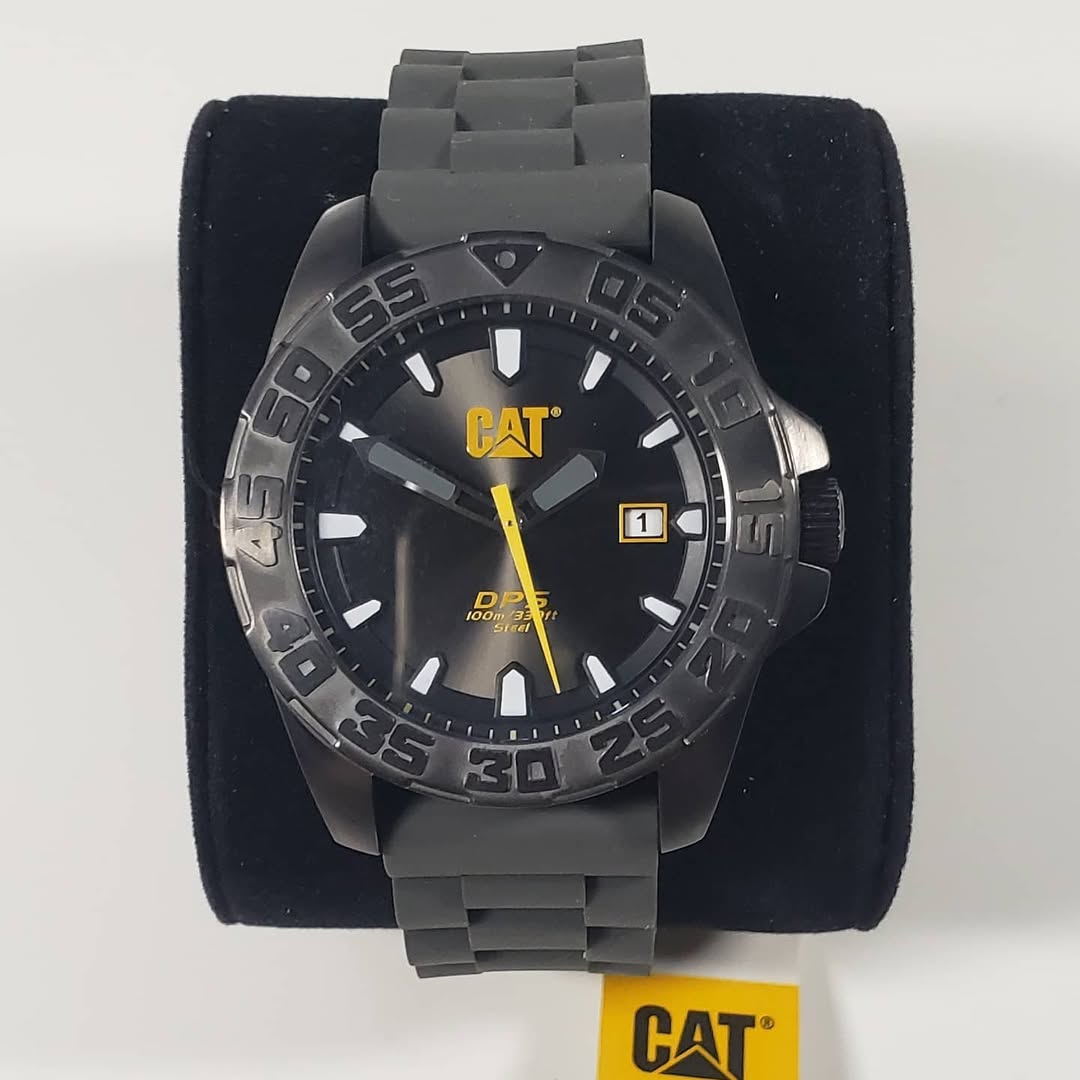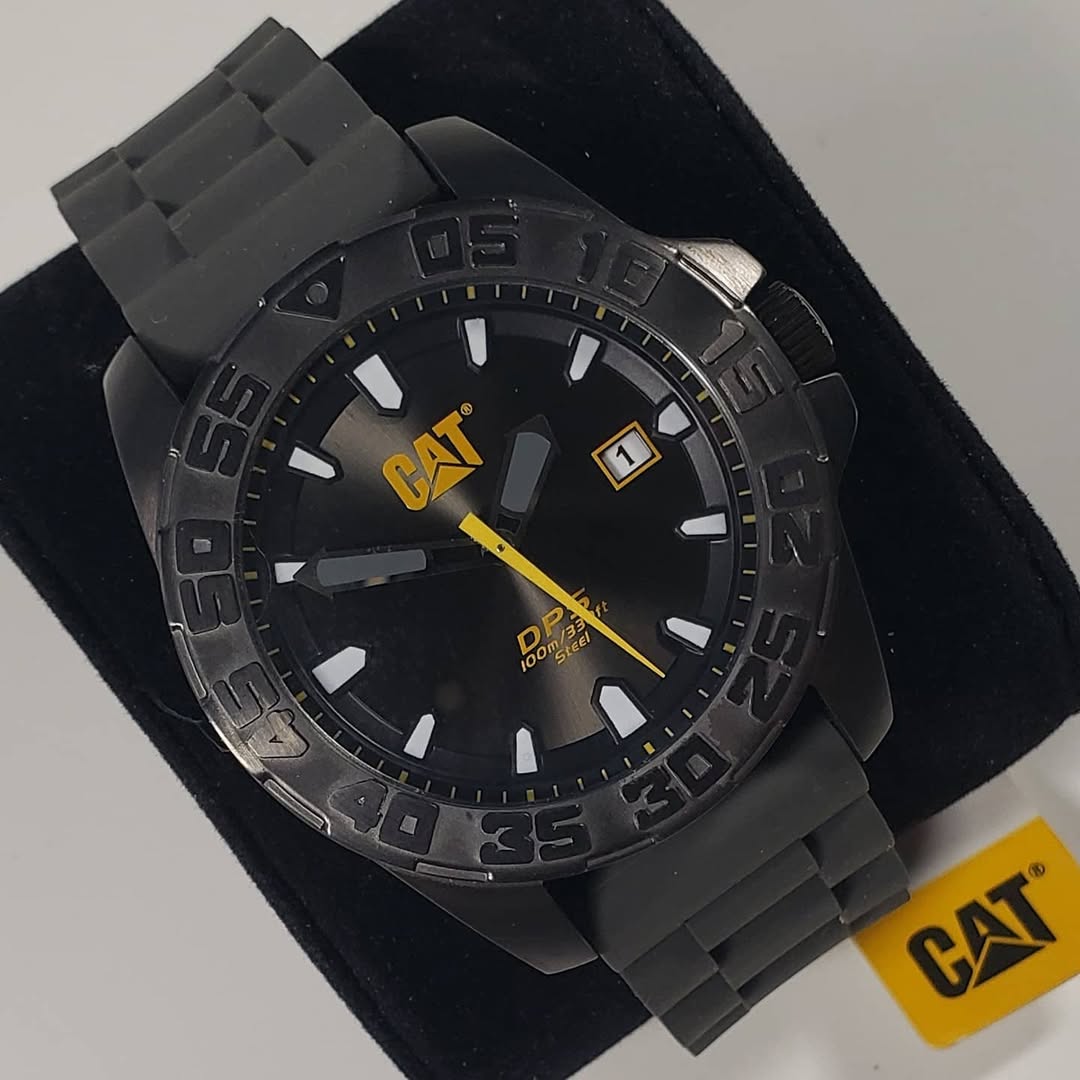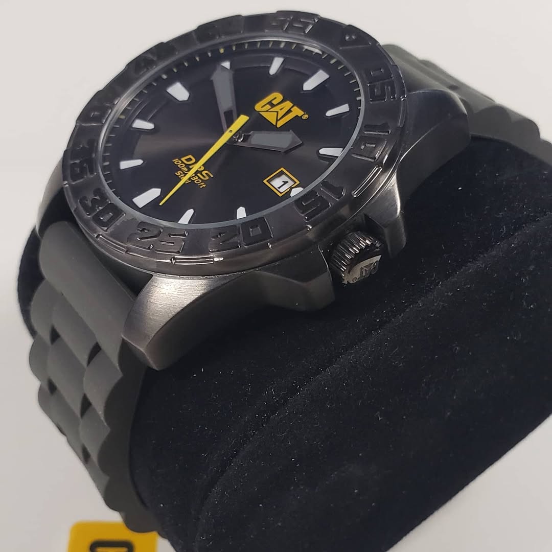 Cualquier dato relevante adicional: Pertenece a la serie PN151. El diseño destaca por su bisel de gran relieve y la protección lateral de la corona, proyectando una imagen de máxima resistencia. El logotipo «CAT» resalta en amarillo bajo la posición de las 12.