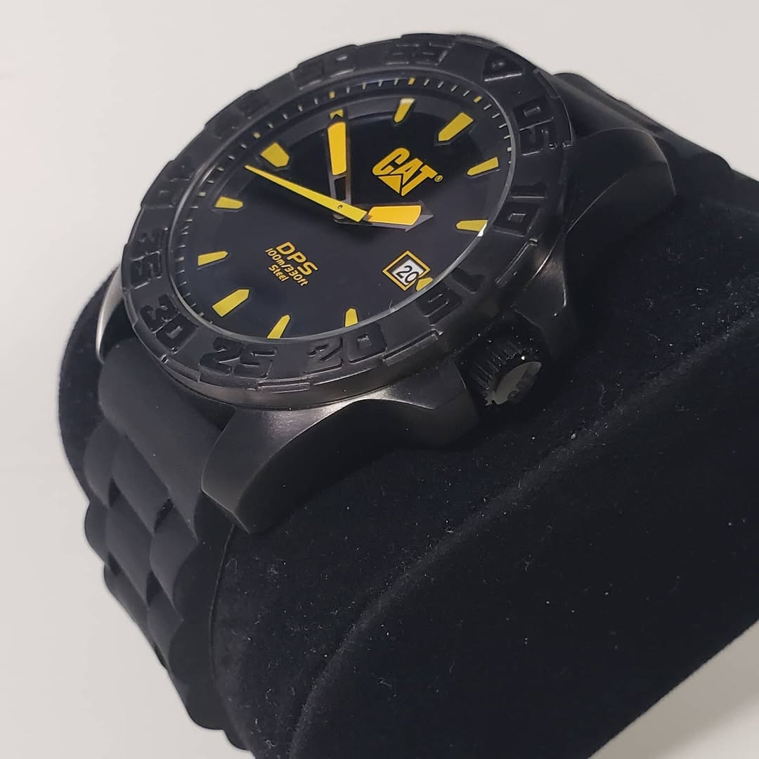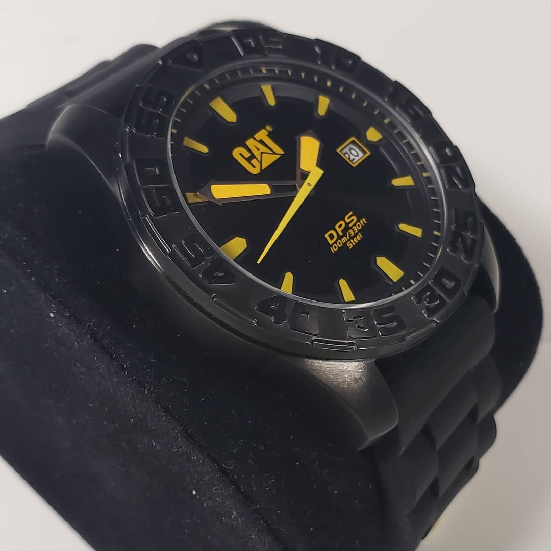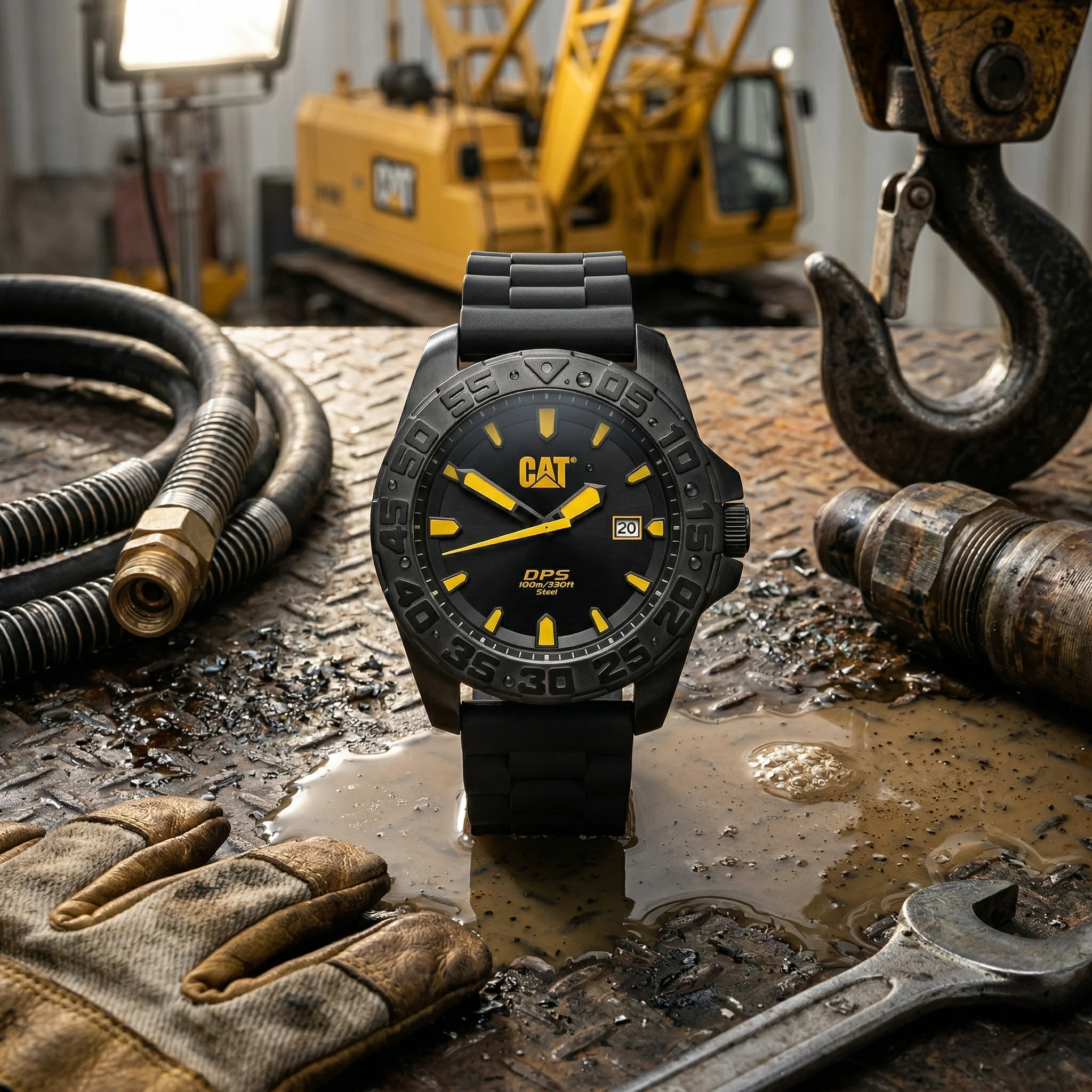 Identidad Visual Imponente: Su esfera negra mate resalta gracias a los índices y manecillas en el icónico amarillo CAT, garantizando una legibilidad superior incluso en condiciones de baja visibilidad o polvo intenso.