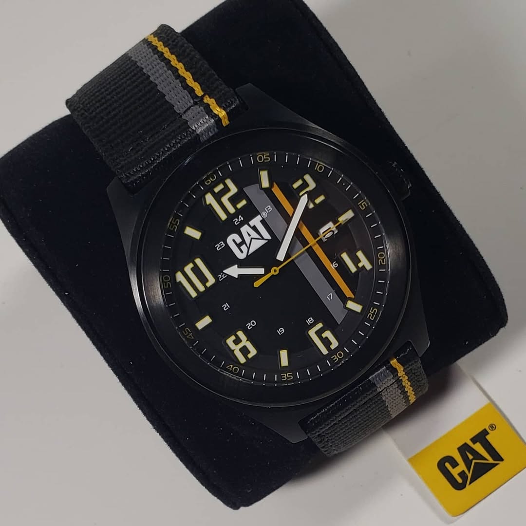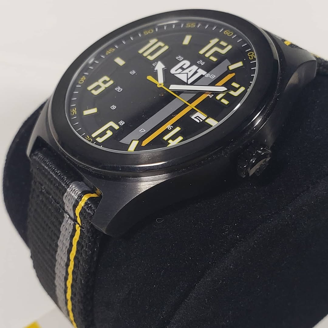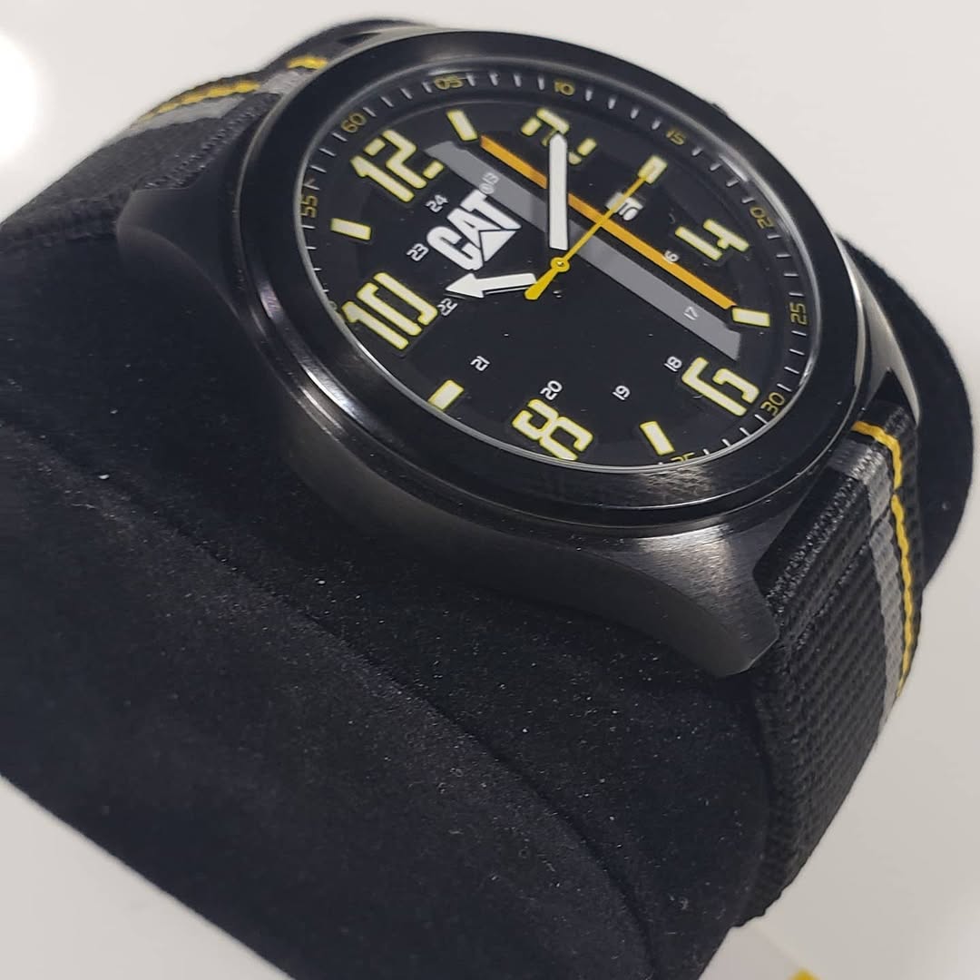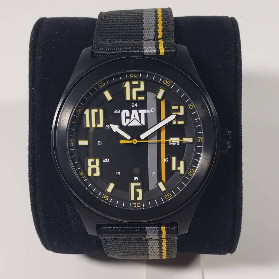 Cualquier dato relevante adicional: Pertenece a la serie PO161. Es un modelo con una fuerte identidad visual «racing/industrial» que utiliza los colores emblemáticos de la marca de una manera moderna y asimétrica. El logotipo «CAT» se sitúa de forma prominente bajo las 12 en punto.