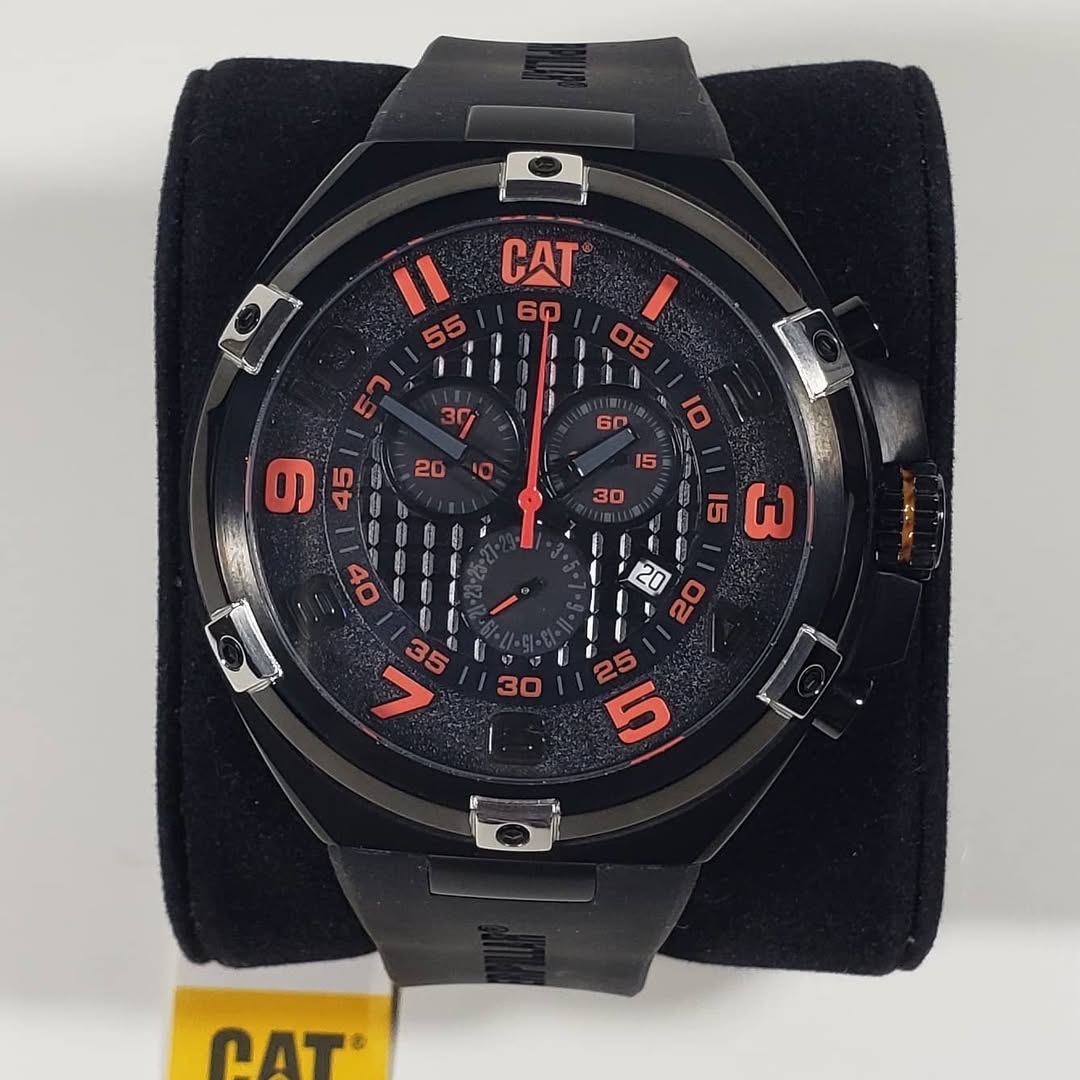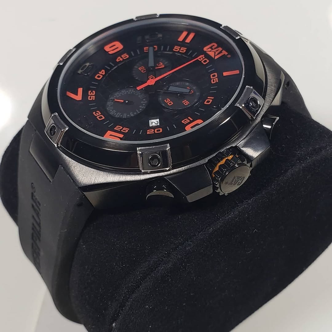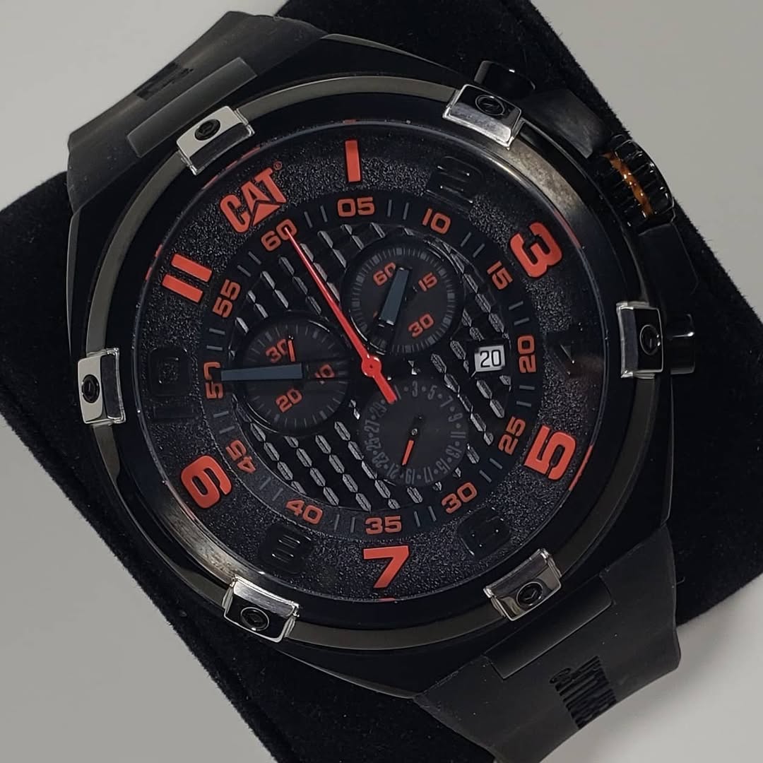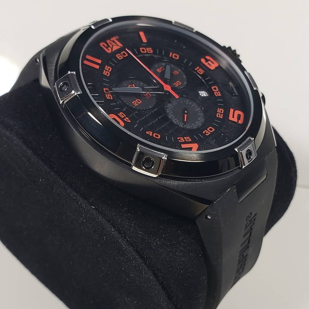 Detalles que marcan la diferencia: Destaca por su imponente caja negra mate y un robusto bisel equipado con cuatro apliques metálicos atornillados que blindan su estructura. La esfera es un auténtico despliegue de texturas, combinando un anillo exterior rugoso tipo asfalto con un dinámico patrón cuadriculado en el centro. Los vibrantes acentos en naranja neón en el logo CAT, los índices, la aguja del segundero y los grandes números arábigos garantizan una lectura instantánea y audaz. Integra funcionalidad cronográfica con tres subesferas, una práctica ventana de fecha entre las 4 y las 5, y una resistente correa de silicona negra grabada con la marca.