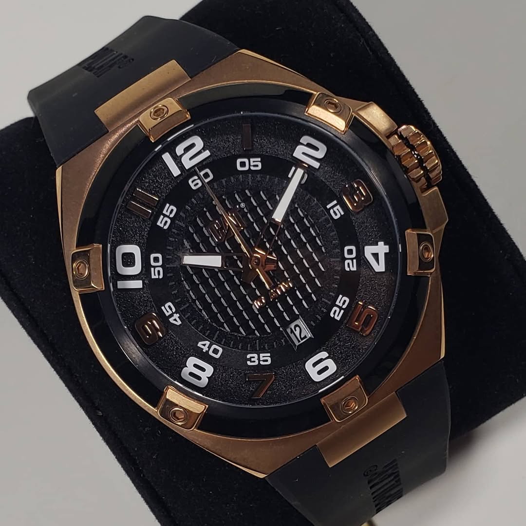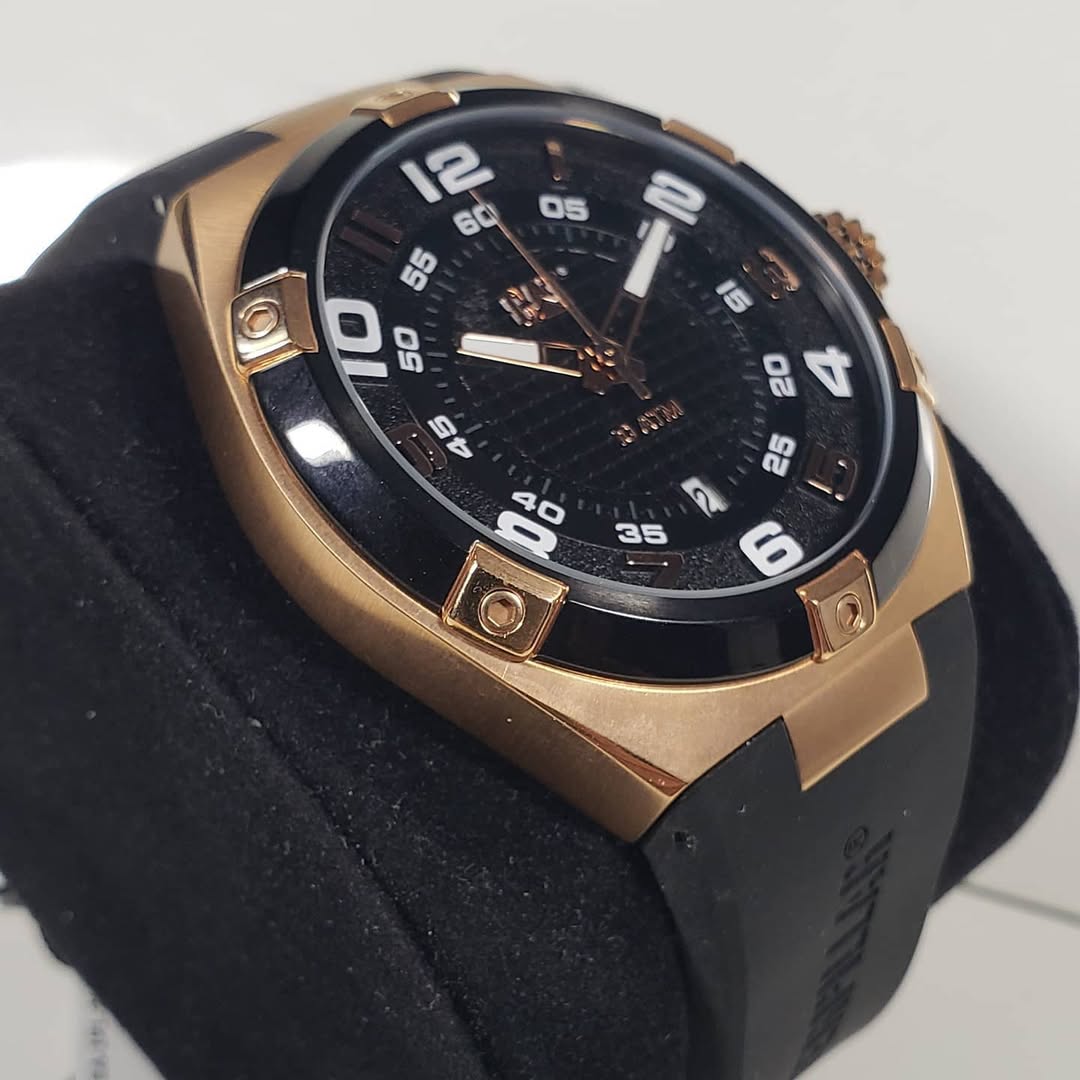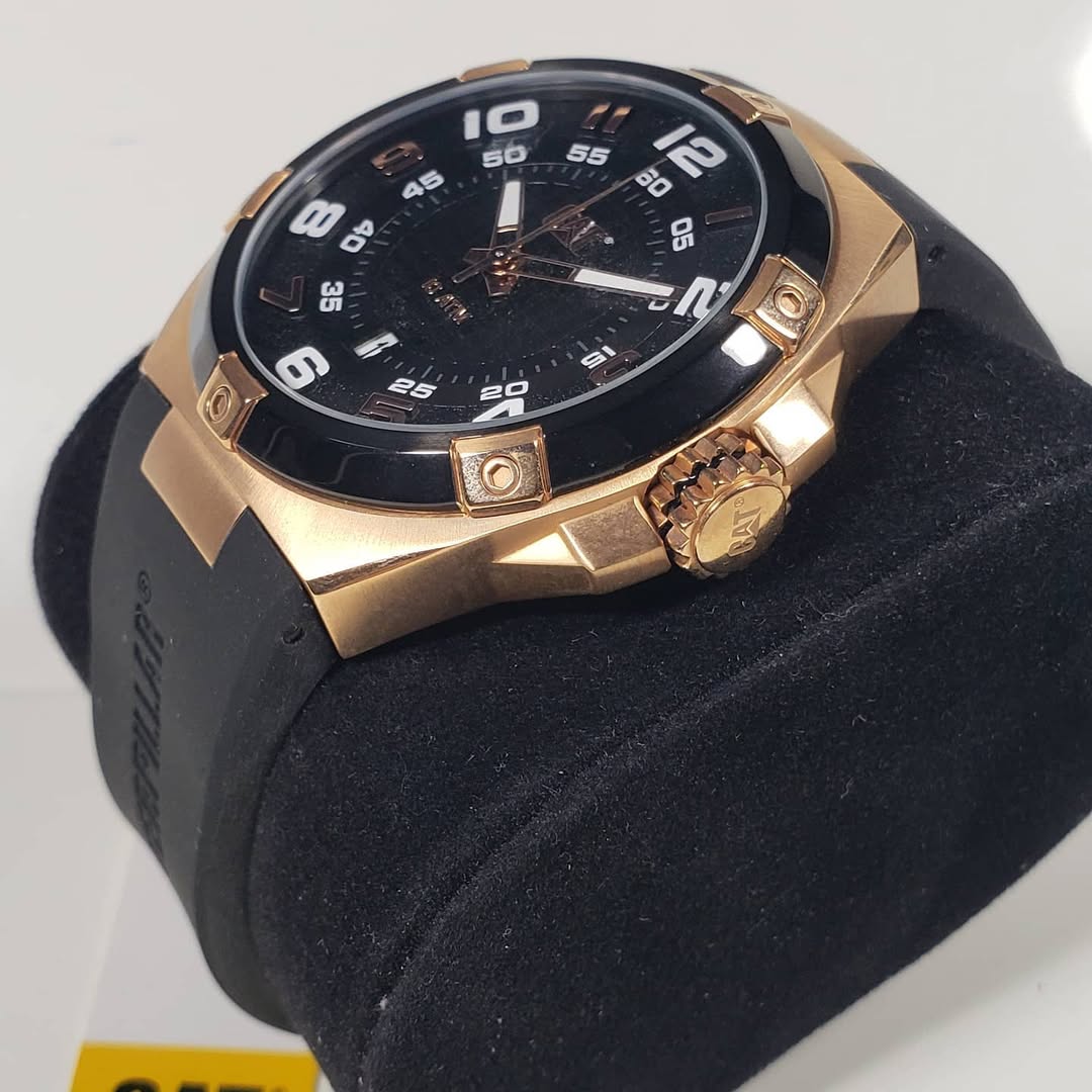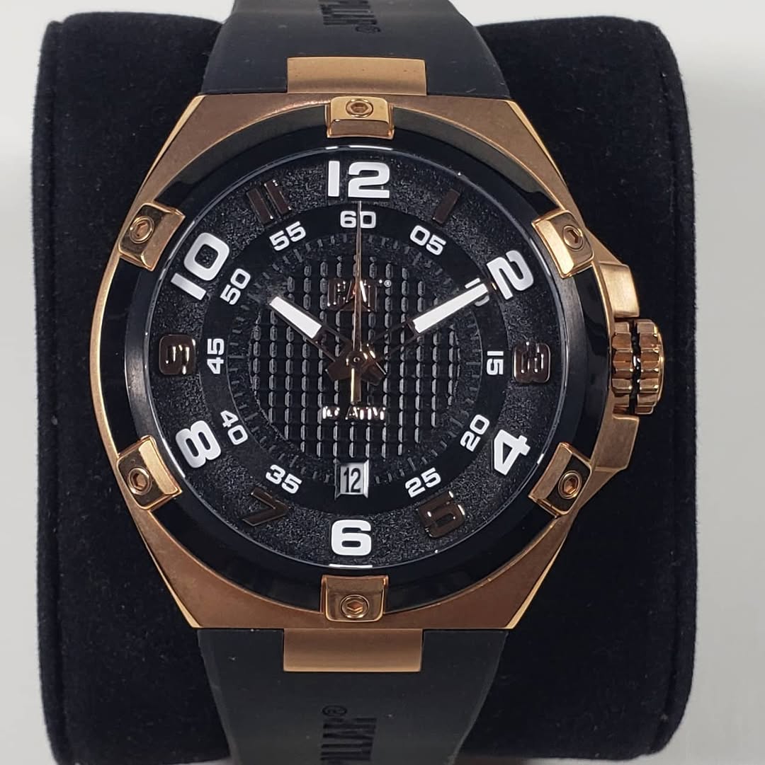 Detalles que marcan la diferencia: Destaca por su imponente caja metálica en tono oro rosa contrastada con un robusto bisel negro que presenta distintivos apliques en relieve. La esfera oscura es un espectáculo visual de texturas, combinando un anillo exterior granulado estilo asfalto con un centro de patrón cuadriculado. Ofrece máxima legibilidad con sus grandes números arábigos y marcadores, complementados con agujas luminiscentes, un dinámico segundero con punta roja y una práctica ventana de fecha a las 6 en punto. Se integra a la perfección con una cómoda y resistente correa de silicona negra que luce el nombre Caterpillar.
