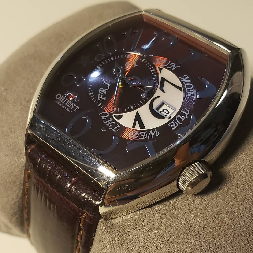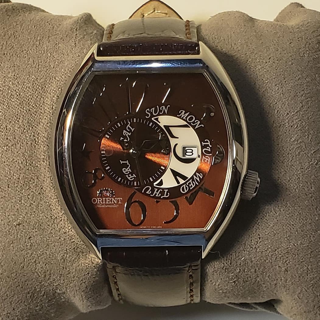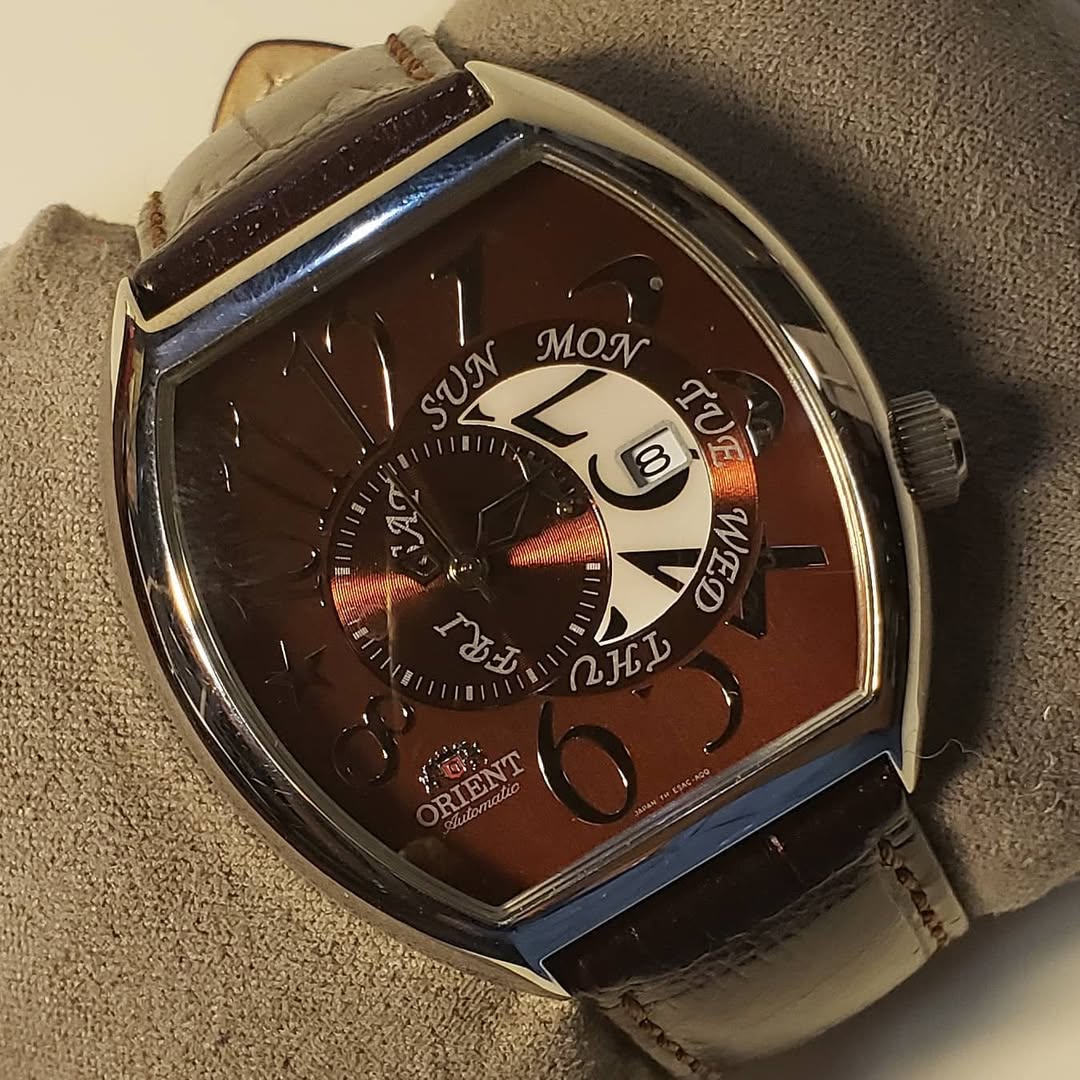 Hazlo tuyo: Es el reloj definitivo para el caballero que aprecia los detalles artesanales y las formas arquitectónicas. Una pieza de Orient que combina la calidez del color chocolate con la frialdad del acero, diseñada para destacar con sobriedad en cualquier evento formal o reunión de negocios.