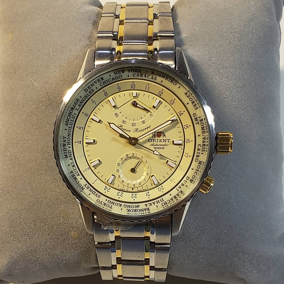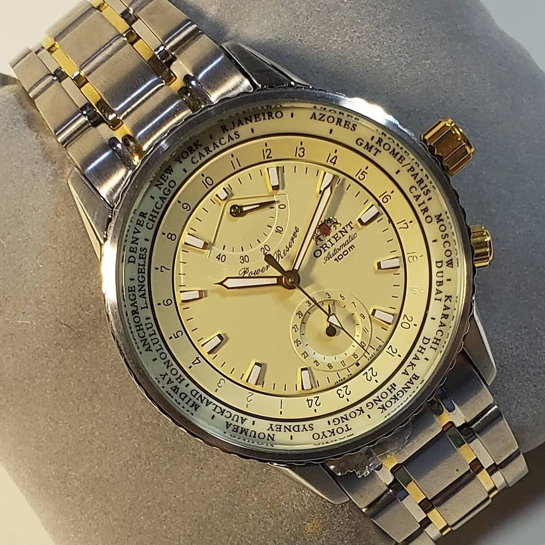 El Orient Automatic Power Reserve CFA02005C0 9673 es una de las piezas más complejas y fascinantes de la marca. Diseñado para el viajero global, este reloj no solo mide el tiempo, sino que permite dominar las zonas horarias con una elegancia bicolor clásica.