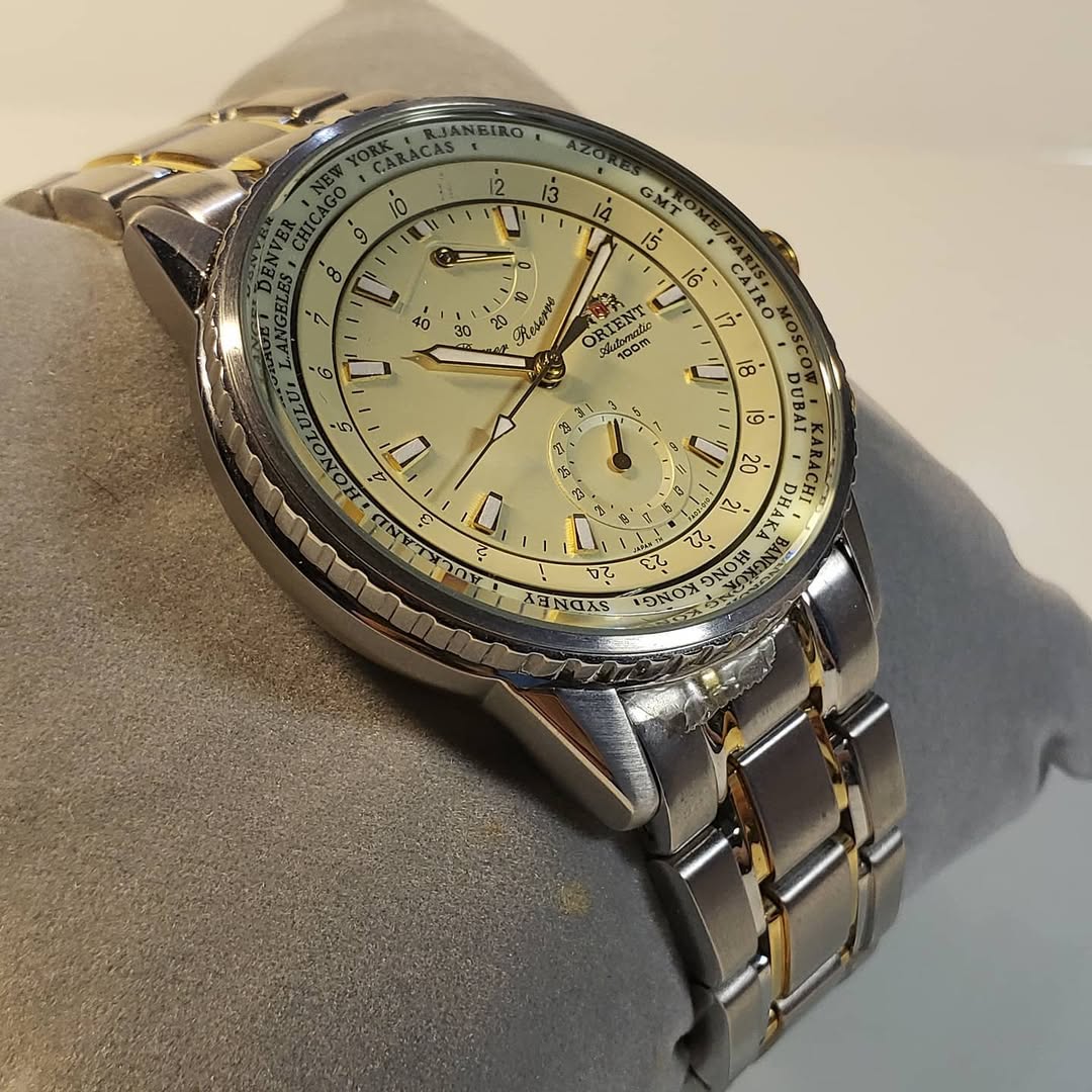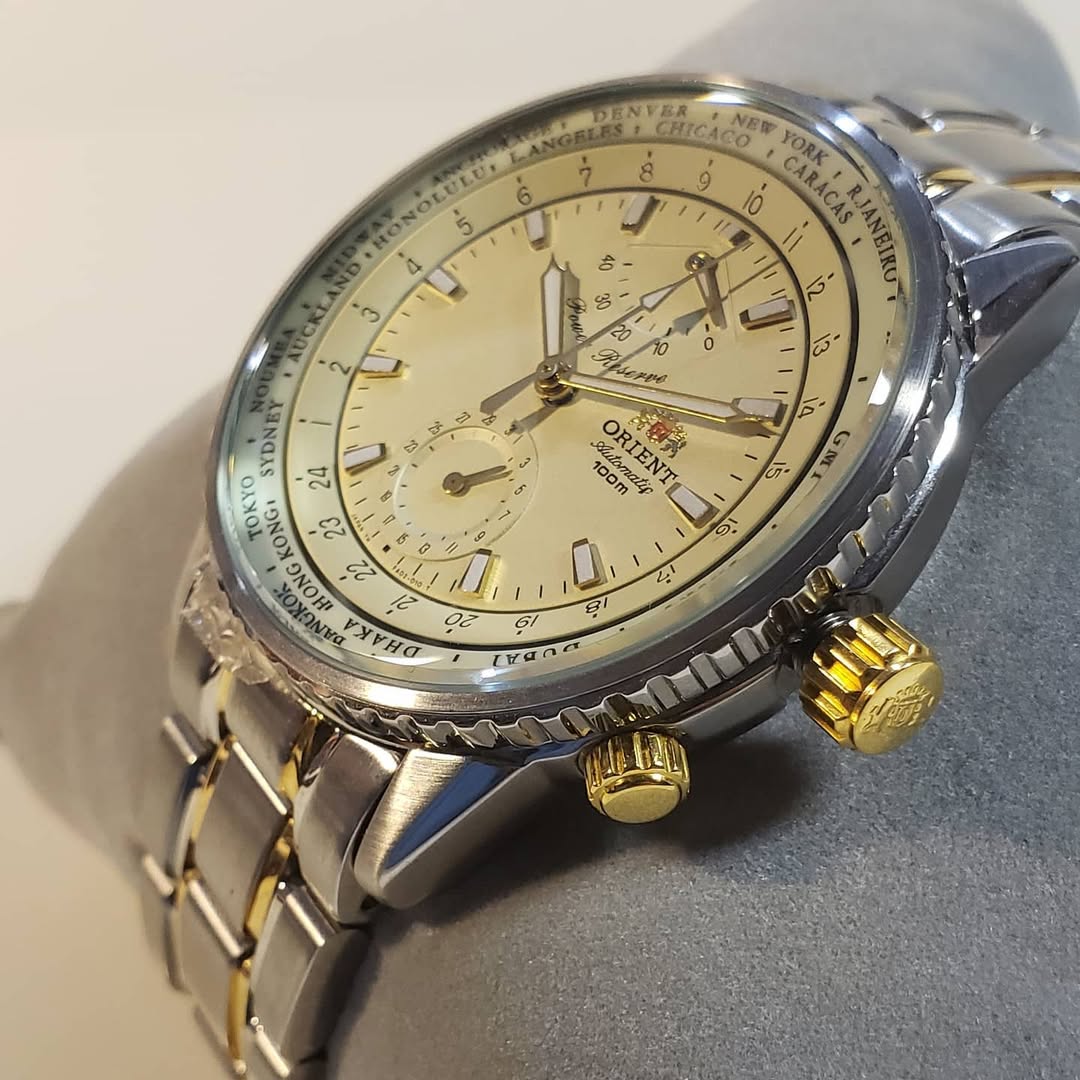 Cualquier dato relevante adicional: Pertenece al modelo CFA02005C0. Es una de las piezas más complejas de Orient, ideal para quienes necesitan gestionar múltiples zonas horarias sin perder la elegancia clásica. La estética de la imagen, con mapas antiguos y artículos de viaje, refuerza su propósito como compañero de expediciones globales.