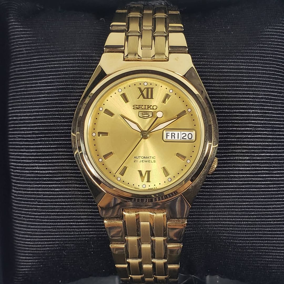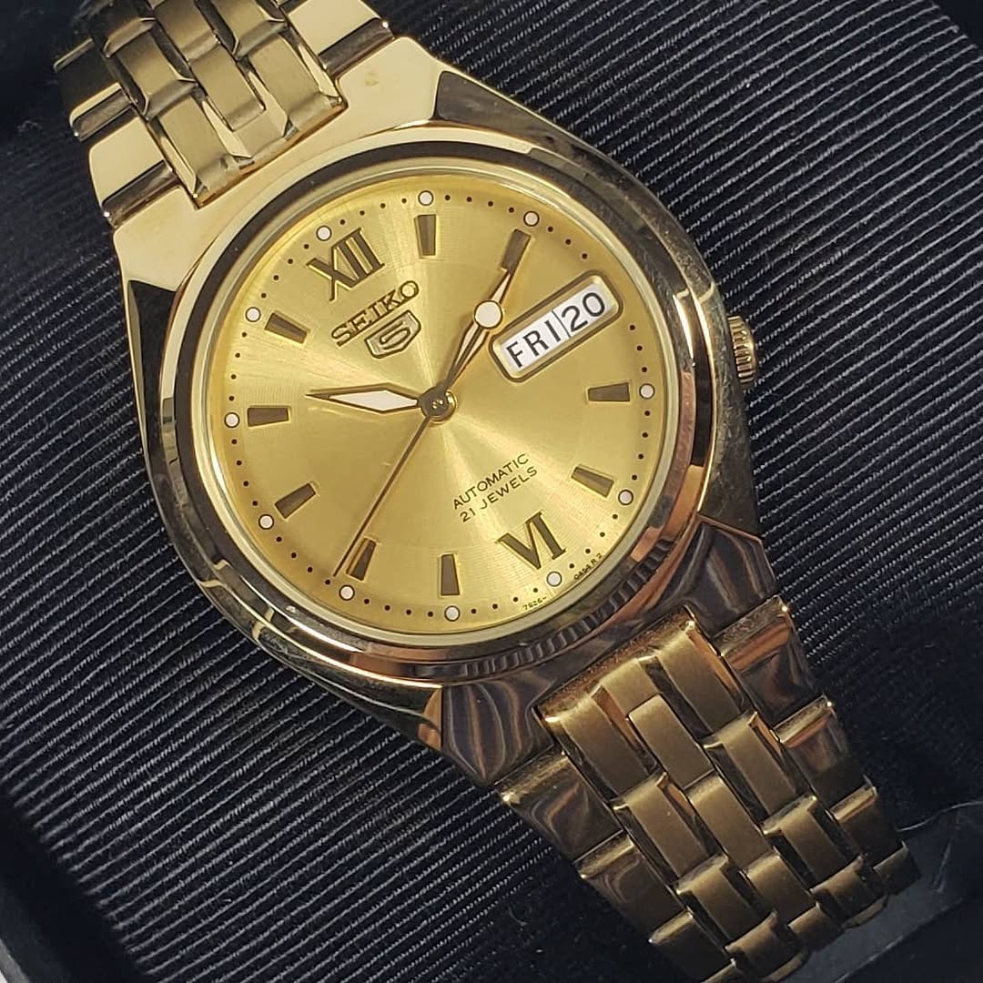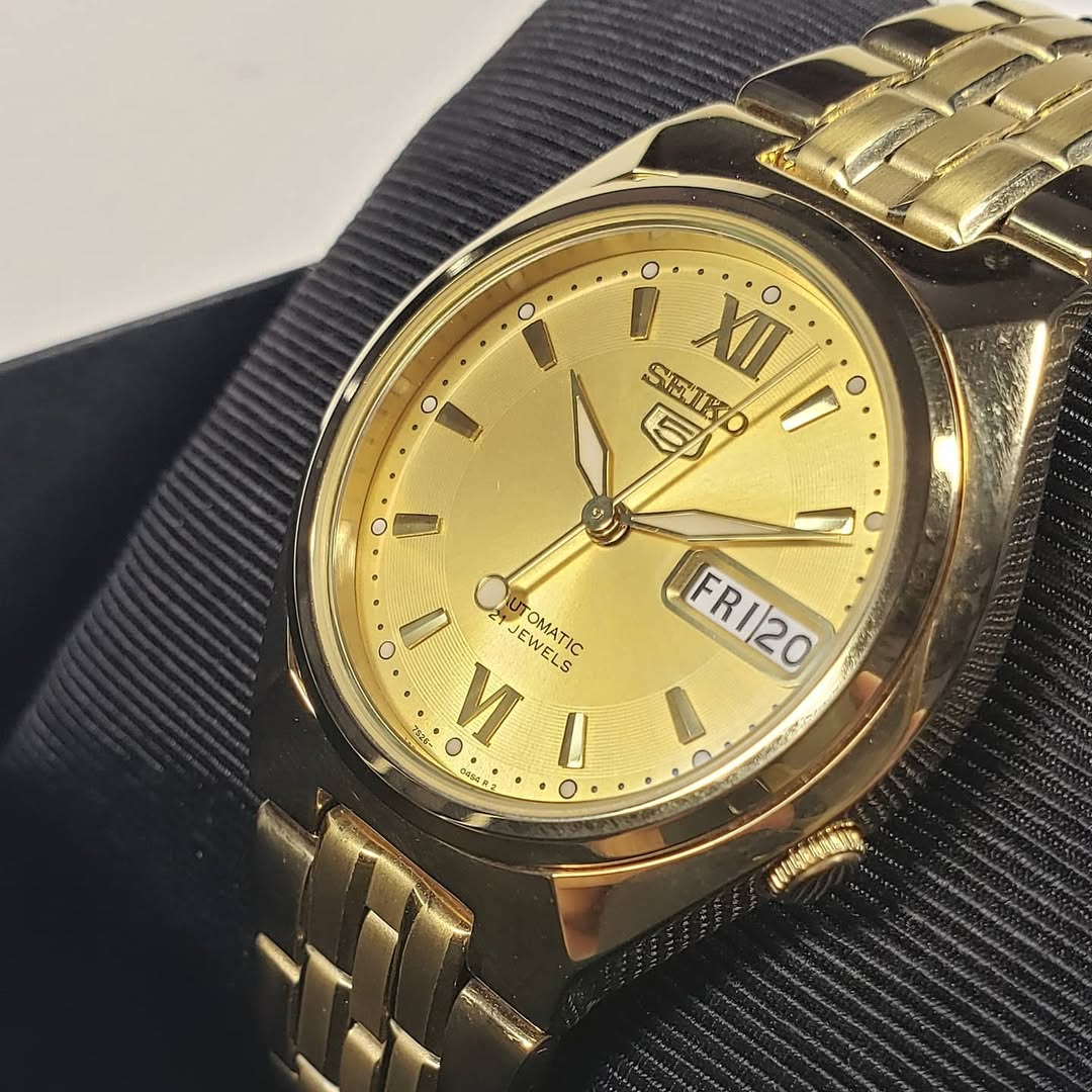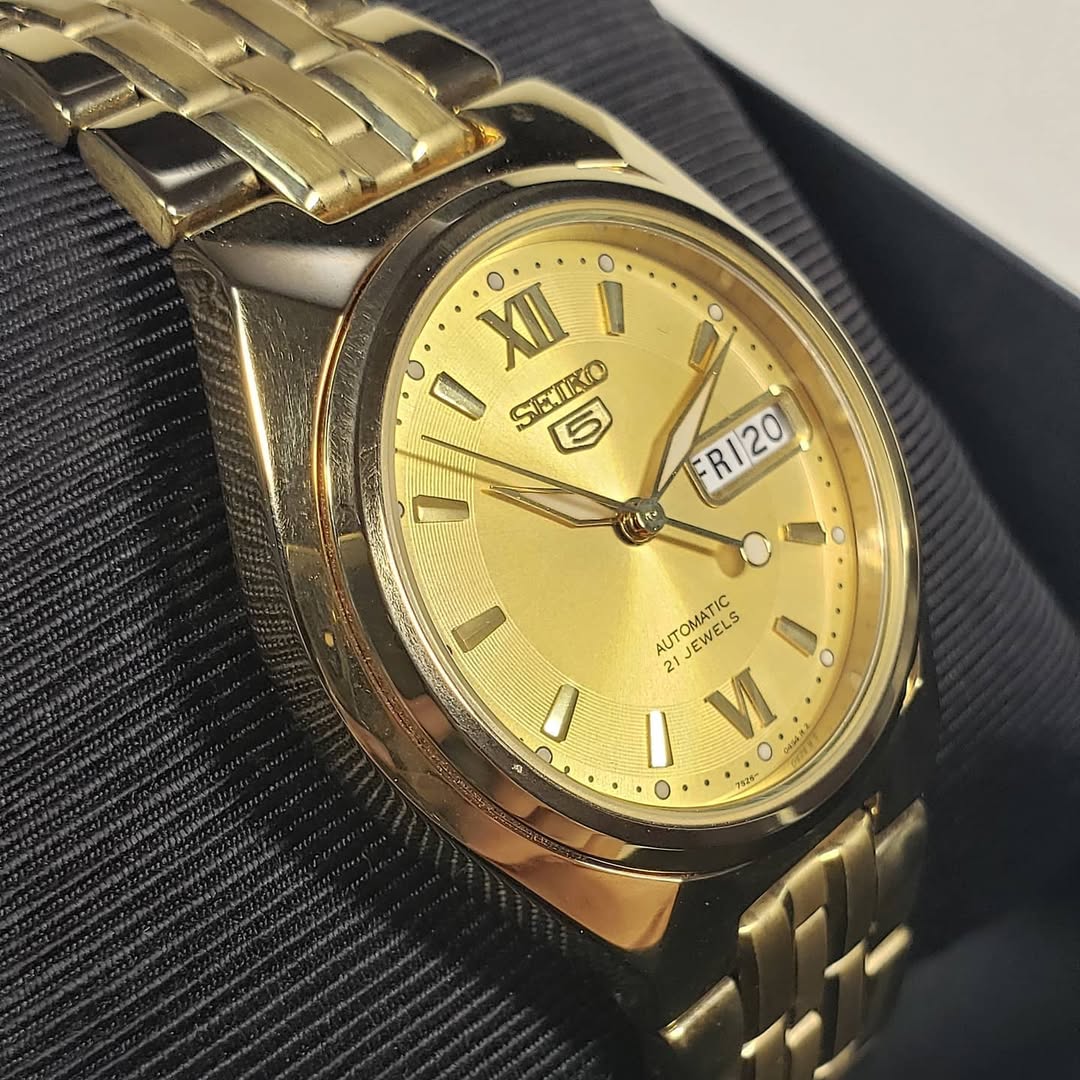 El Seiko 5 SNK322 (Ref. 7126) destaca en la familia dorada de Seiko por introducir un elemento de sofisticación tradicional: los números romanos. Es la pieza ideal para quien busca el impacto visual del oro, pero con un diseño que evoca la relojería clásica y formal de las grandes casas europeas.
