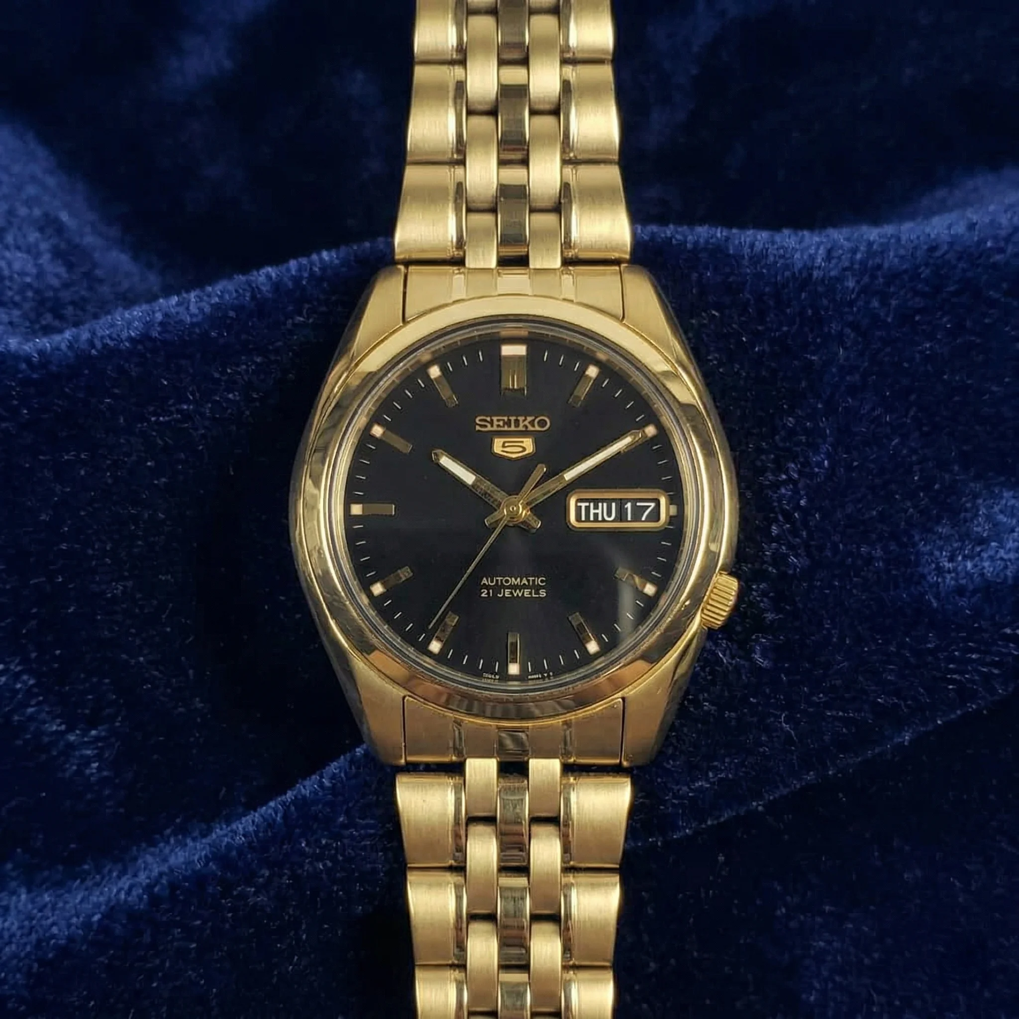 Corona: Situada a las 4 en punto, característica de la línea Seiko 5 para garantizar que la corona no se clave en la muñeca y para proteger la tija contra impactos laterales.
