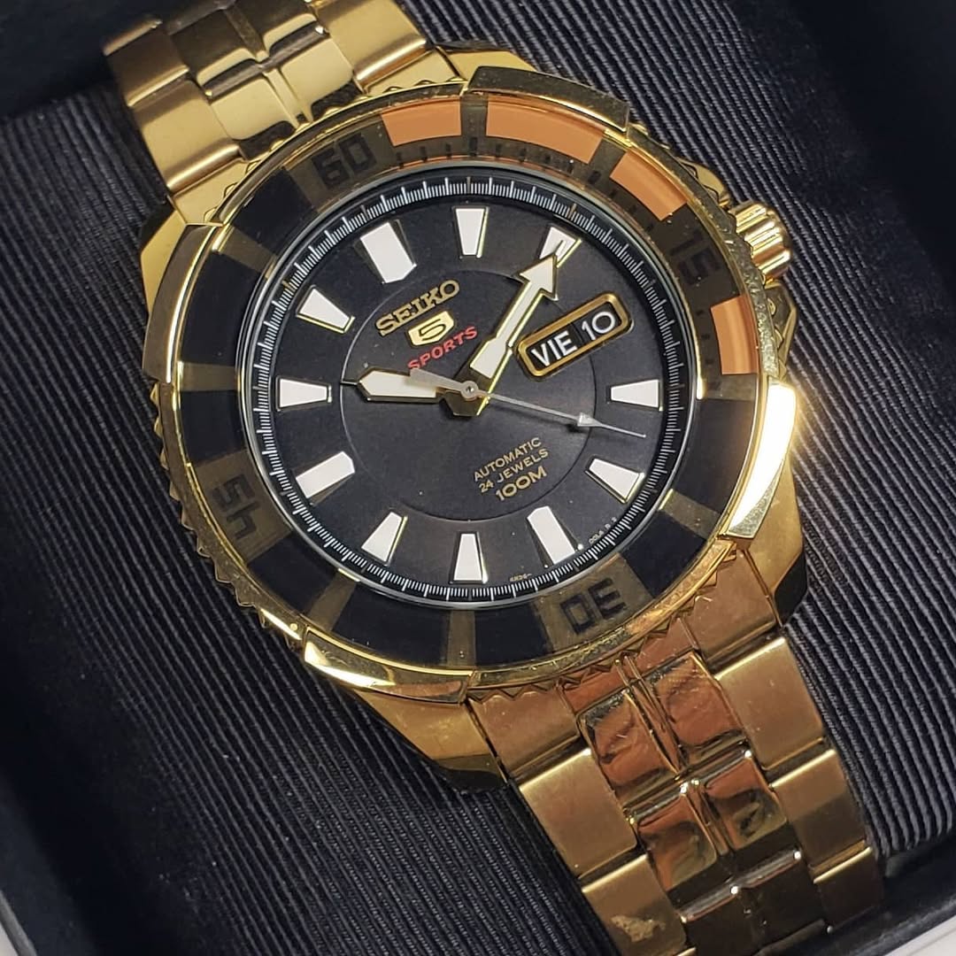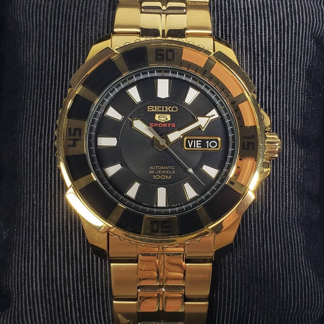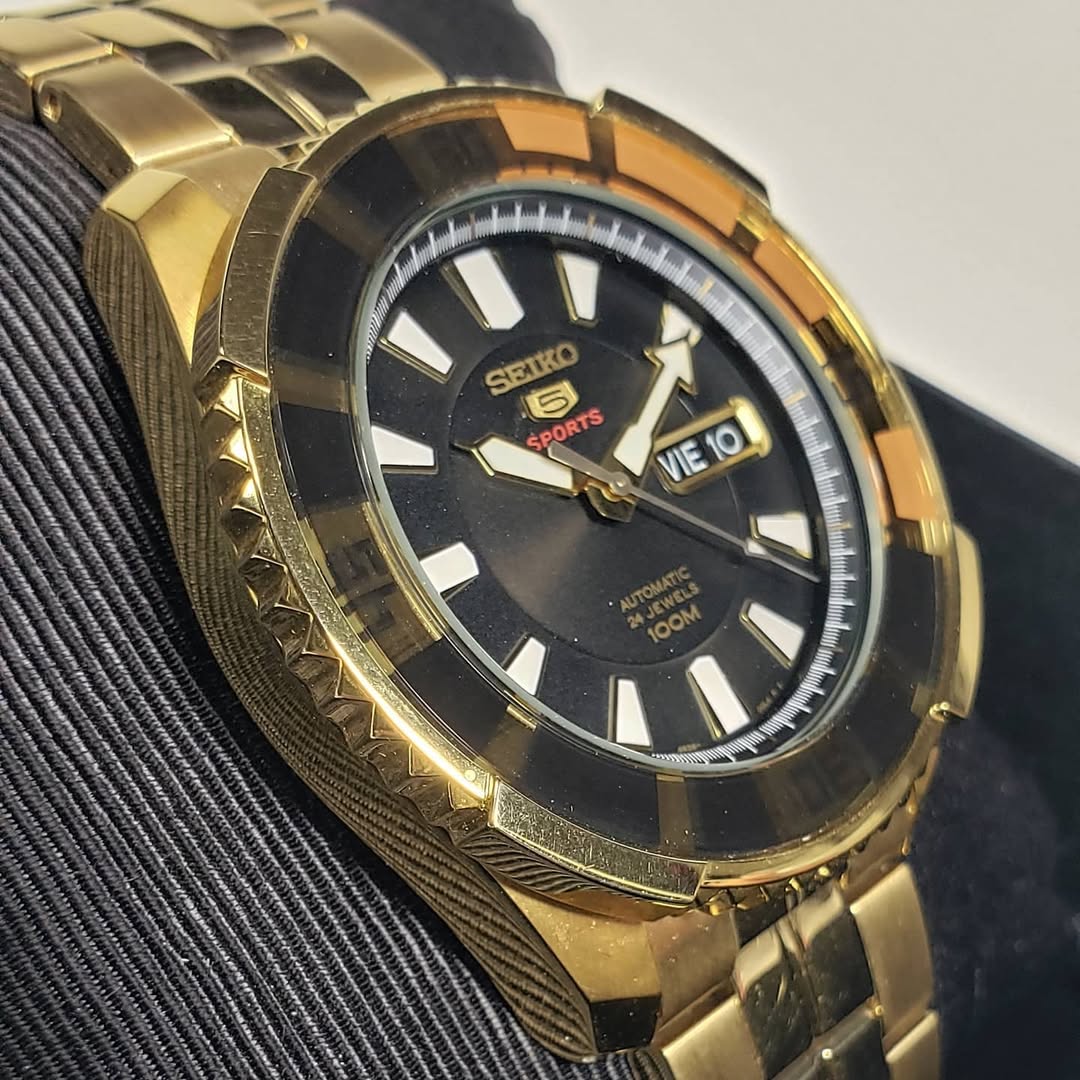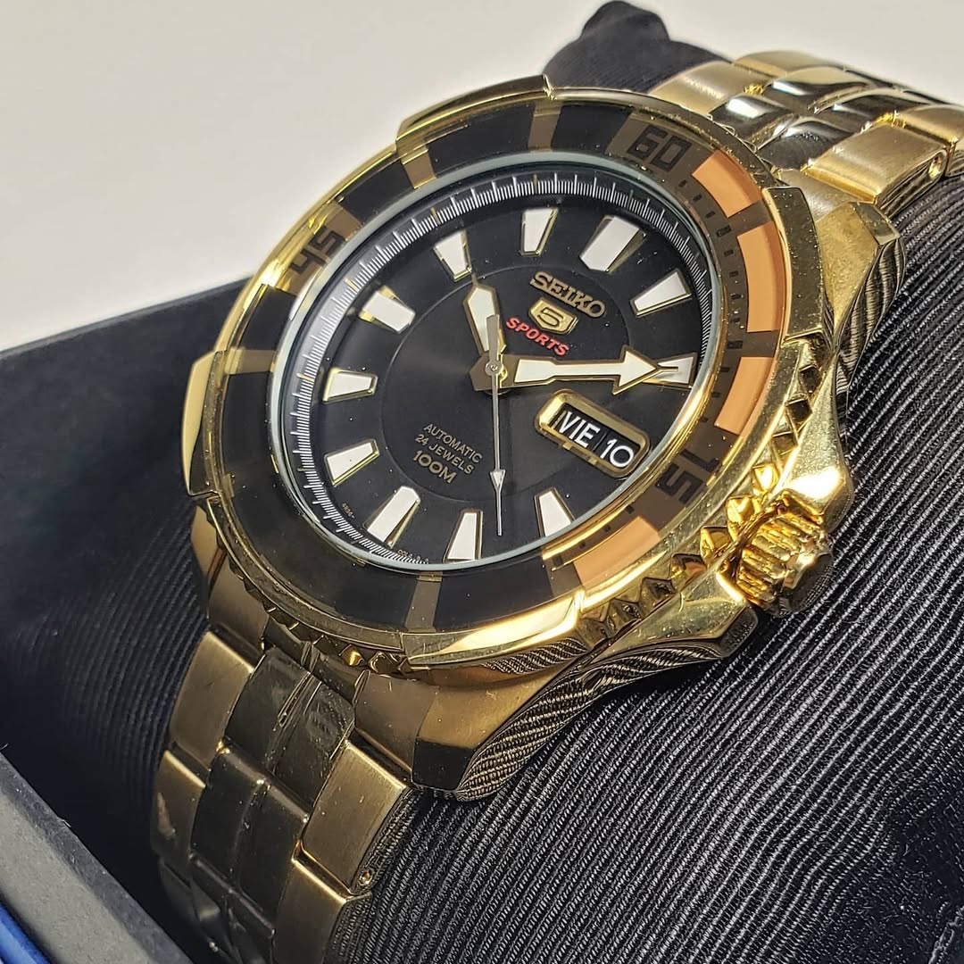 El SRP208 es lo que en el mundo del coleccionismo llamaríamos un «Diver de lujo casual». Pertenece a una generación de Seiko 5 Sports que decidió aumentar el tamaño y la presencia mecánica. Su diseño destaca por el uso de contrastes fuertes: el negro profundo de la esfera y el bisel contra el brillo cálido del oro. Es el reloj perfecto para quienes disfrutan de una estética «Gold & Bold», ideal para lucir en ambientes náuticos o eventos casuales donde se busca una pieza con mucho carácter.